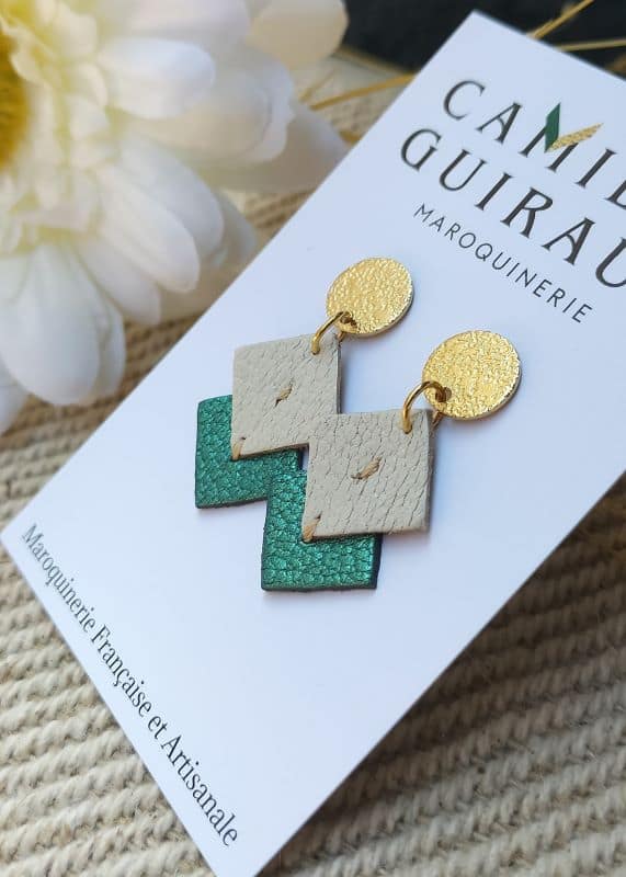 Les petites boucles rondes blanc cassé vert metallisé sont composées d’un support en acier inoxydable (sans cadmium, sans aluminium et sans nickel) et de deux losanges en cuir coloré de veau, chèvre ou vache.